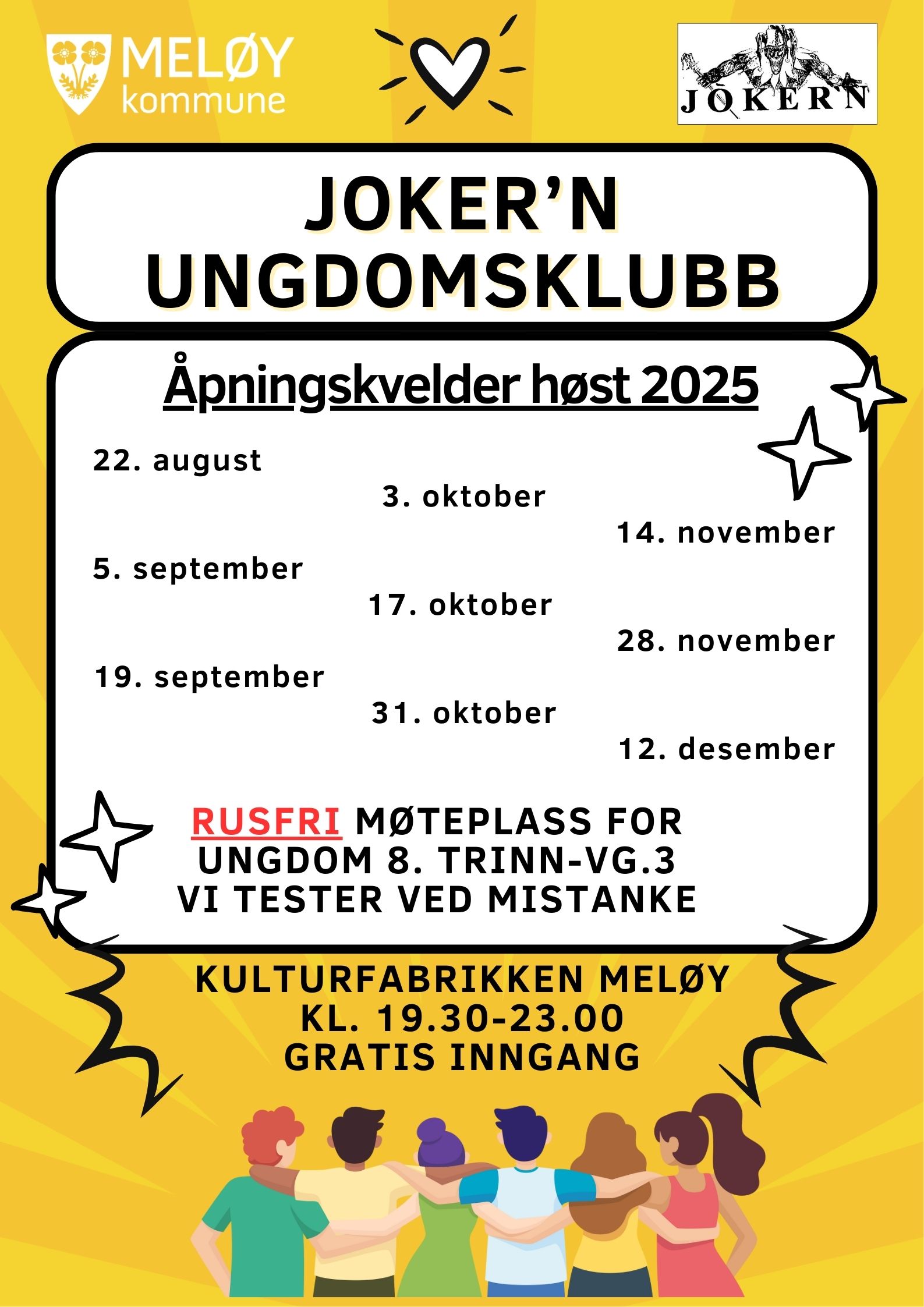 Fredag 22. august er høstens første åpningskveld på Joker’n ungdomsklubb. Vi ønsker alle fra 8. trinn til og med vg3 velkommen på klubben.