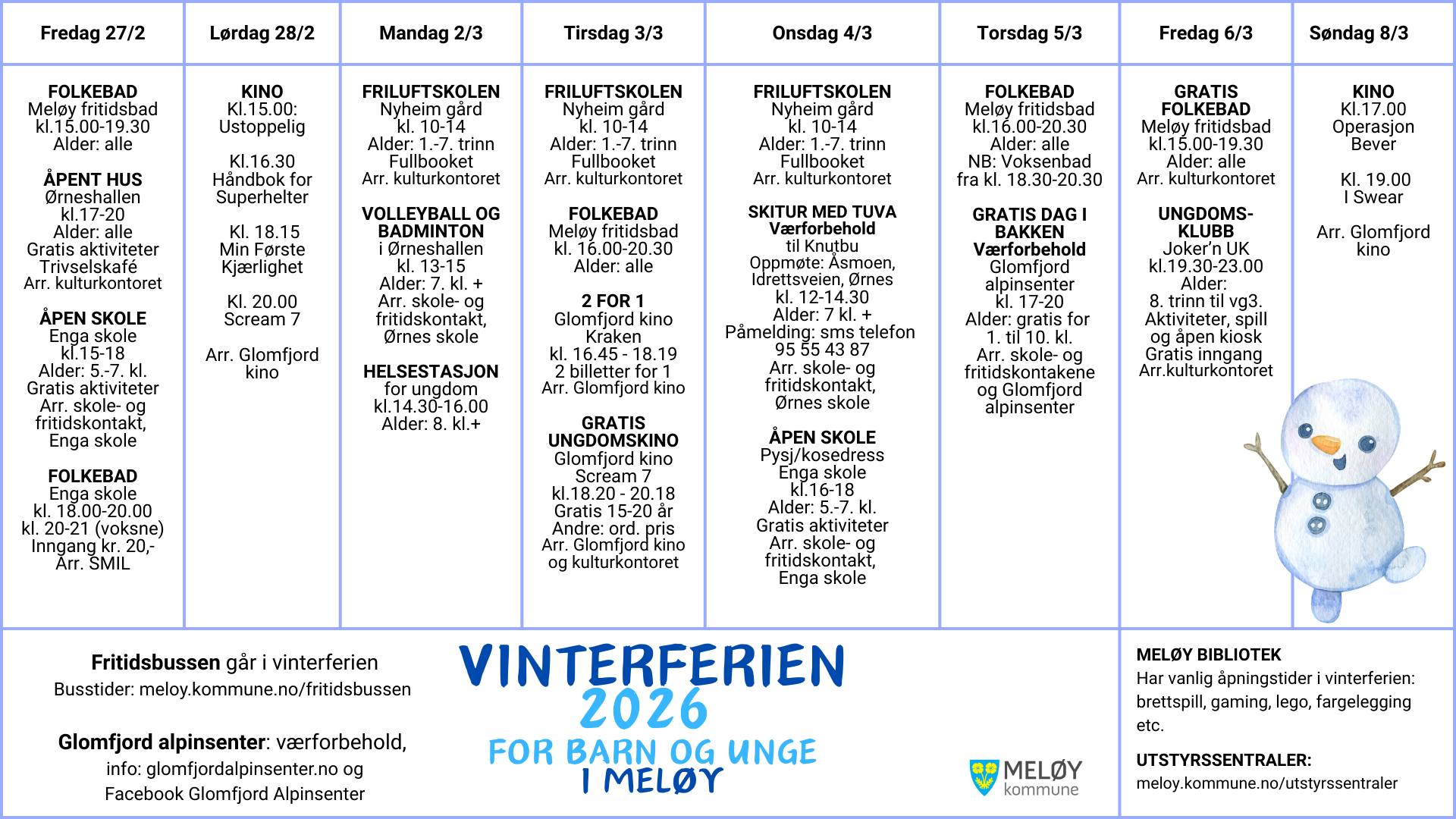 Vinterferieaktiviteter 2026 Vi har flere spennende aktiviteter for barn og unge i vinterferien! Les mer på oversikten.